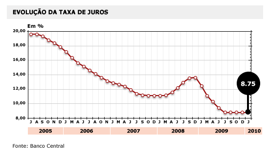 No início de 2009, os juros estavam em 13,75% ao ano. Em janeiro, o Copom fez o primeiro corte desde a piora da crise econômica a partir de setembro de 2008, para 12,75% a.a.. Na reunião de março, os juros caíram novamente, para 11,25% a.a.
